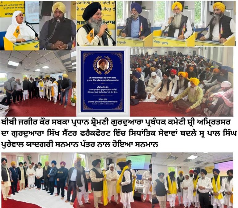 ਫਰੈਕਫੋਰਟ ਵਿੱਚ ਬੀਬੀ ਜਗੀਰ ਕੌਰ ਵੱਲੋਂ ਨਿਭਾਈਆਂ ਸਿਧਾਂਤਿਕ ਸੇਵਾਵਾਂ ਬਦਲੇ ਮੂਲ ਨਾਨਕਸ਼ਾਹੀ ਕਲੰਡਰ ਦੇ ਨਿਰਮਾਤਾ ਸ੍ਰ ਪਾਲ ਸਿੰਘ ਪੁਰੇਵਾਲ ਯਾਦਗਰੀ ਸਨਮਾਨ ਪੱਤਰ ਨਾਲ ਕੀਤਾ ਸਨਮਾਨਤ ।